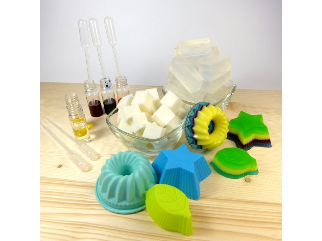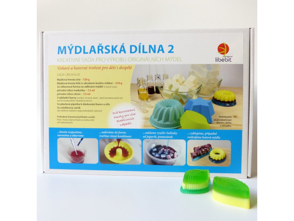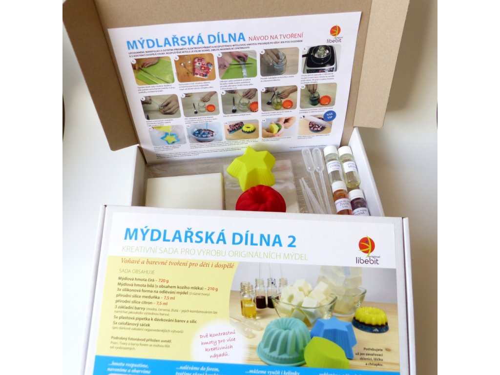 Mýdlařská dílna 2 – kreativní sada pro výrobu originálních přírodních mýdel. Obsahuje dva druhy mýdlové hmoty, esenciální oleje, barvy a formičky, díky kterým vytvoříte voňavá a barevná mýdla pro radost i jako dárek.
